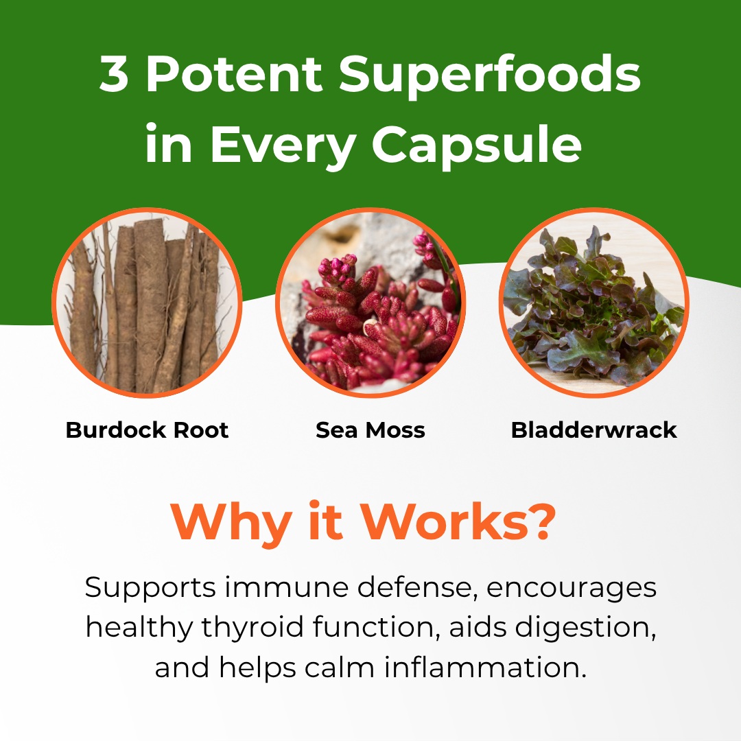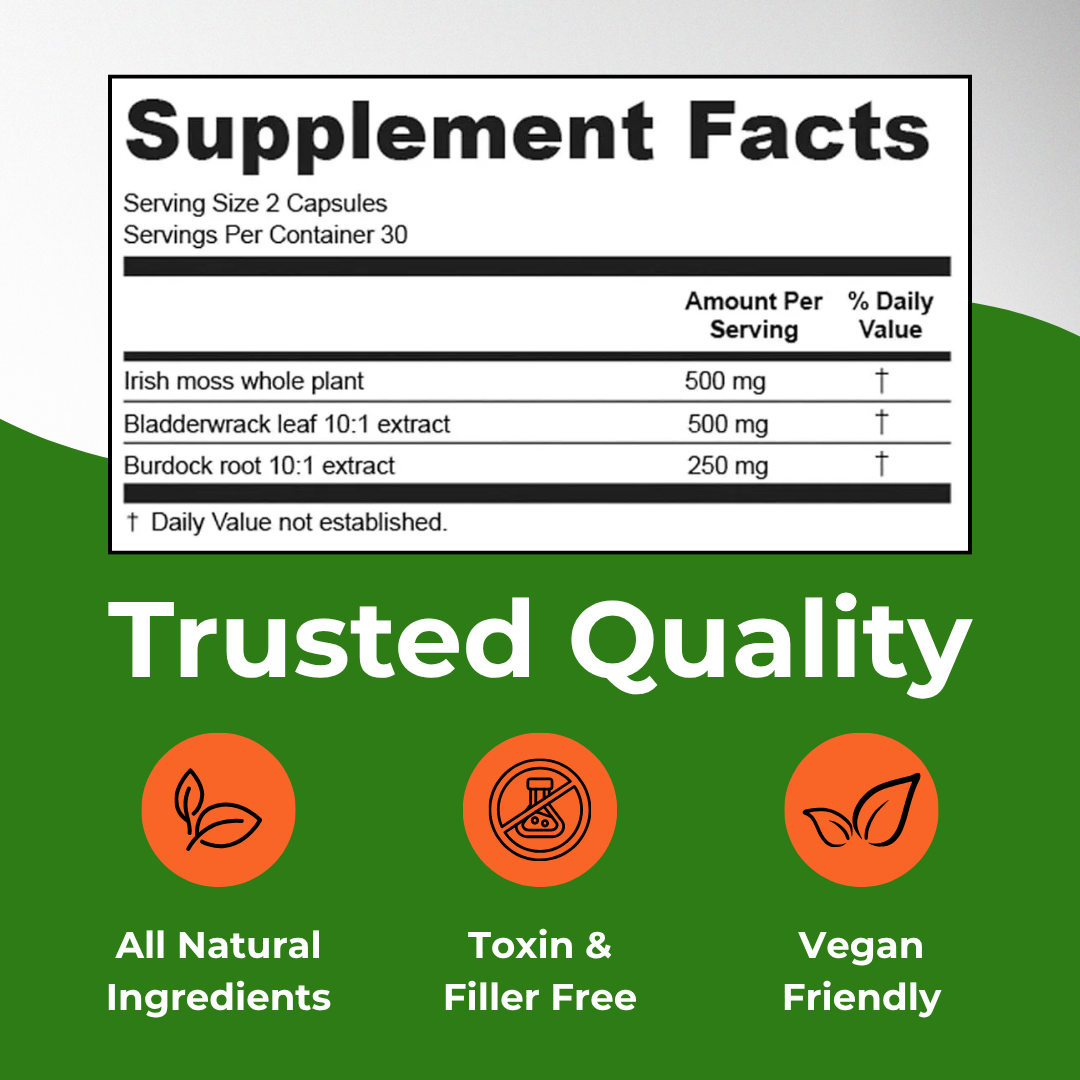 Packed with essential vitamins and minerals from sea moss, bladderwrack, and burdock root to help strengthen your immune system, support thyroid function, and promote natural energy.